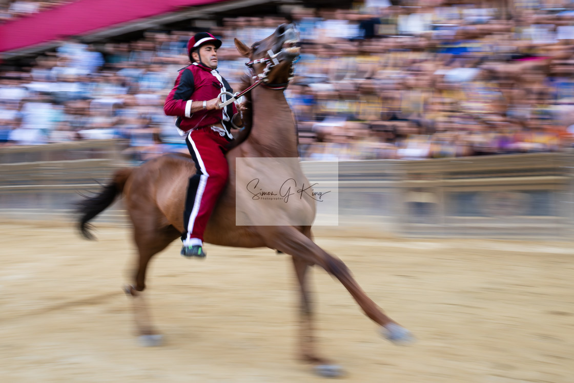 Jonatan Bartoletti detto Scompiglio for Civetta Contrada rides Benitos in the Prova Generale during the Palio di Siena in Siena, Tuscany, Italy on 15 August 2025.